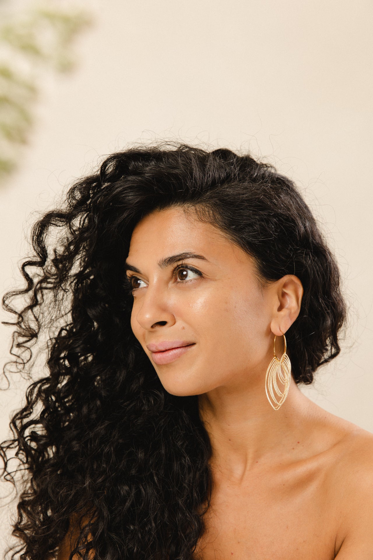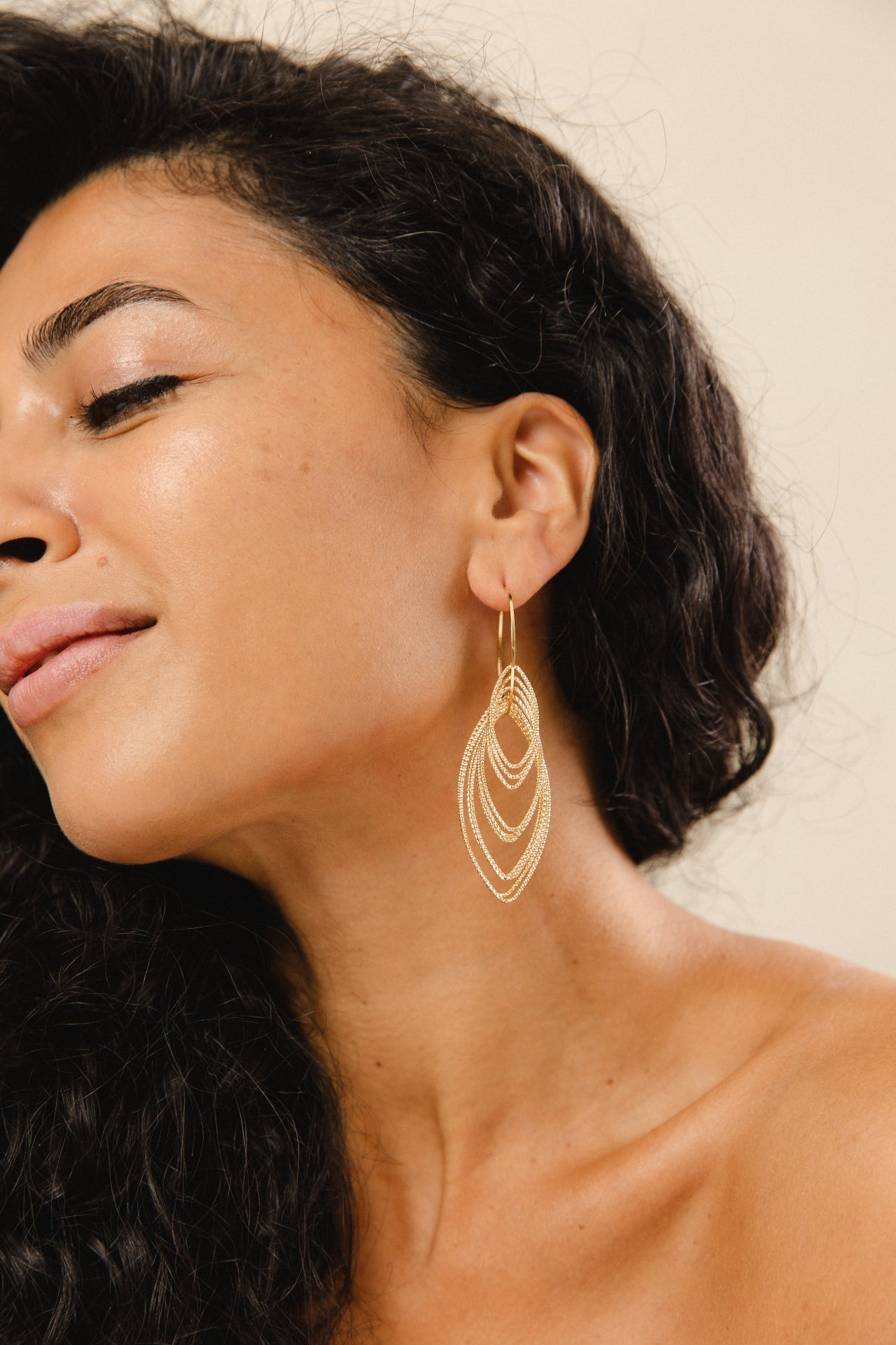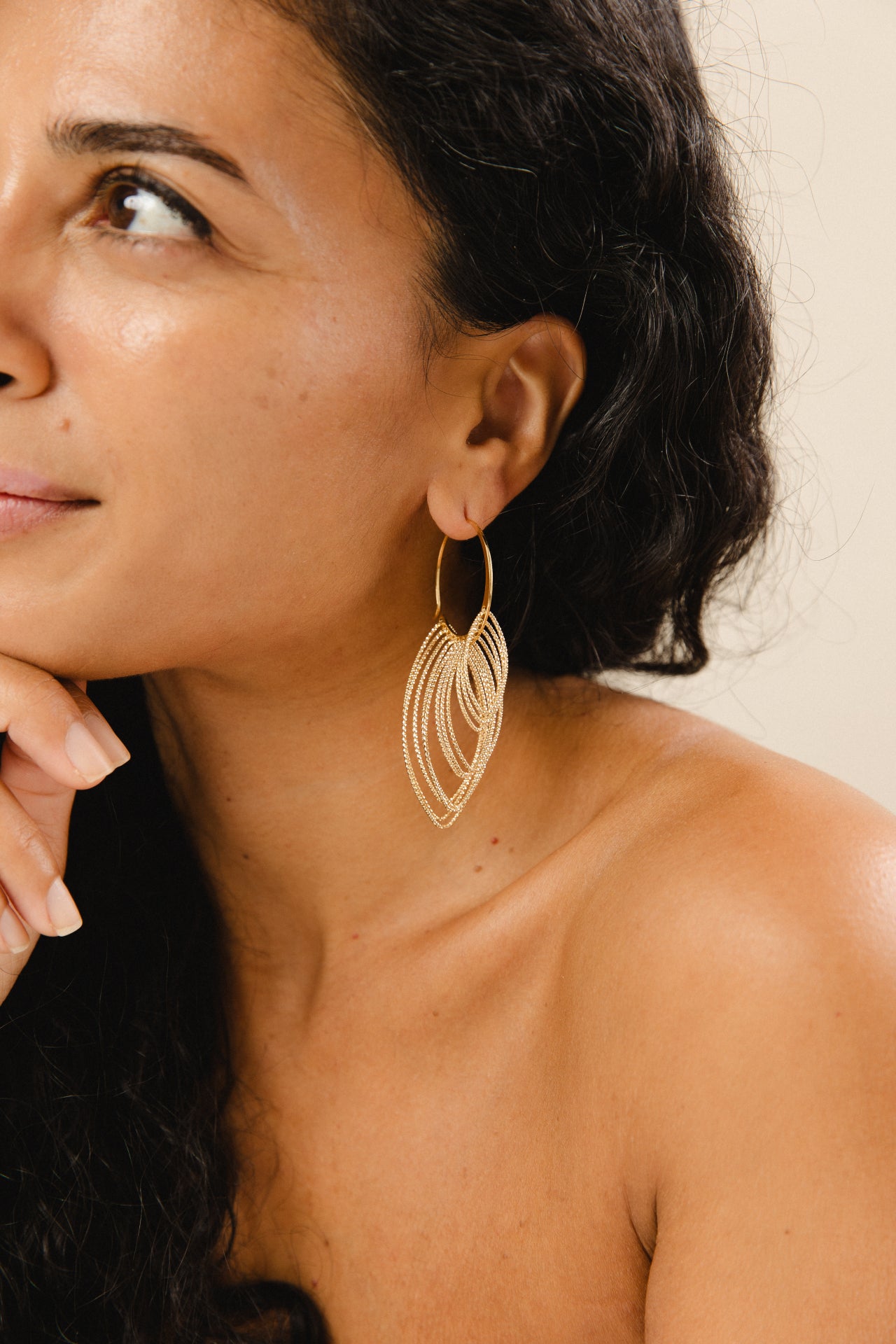 We love earrings that turn heads, the CHANDELIER D'OR drops do just that. Hoop design with graduated, layered elements, in sparkly gold plated silver.