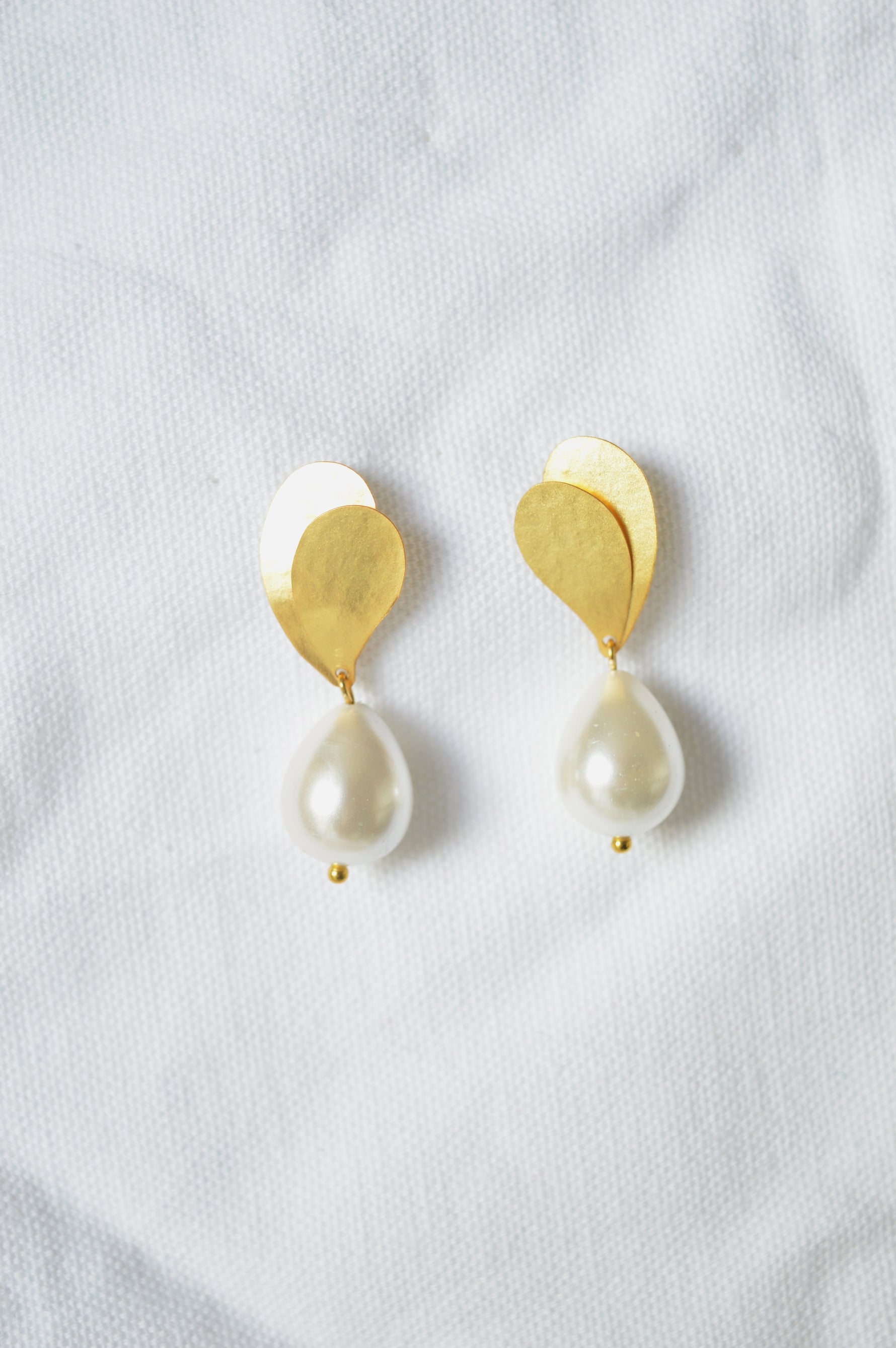 FEUILLE • Bronze Leaf Pearl Drop Earrings