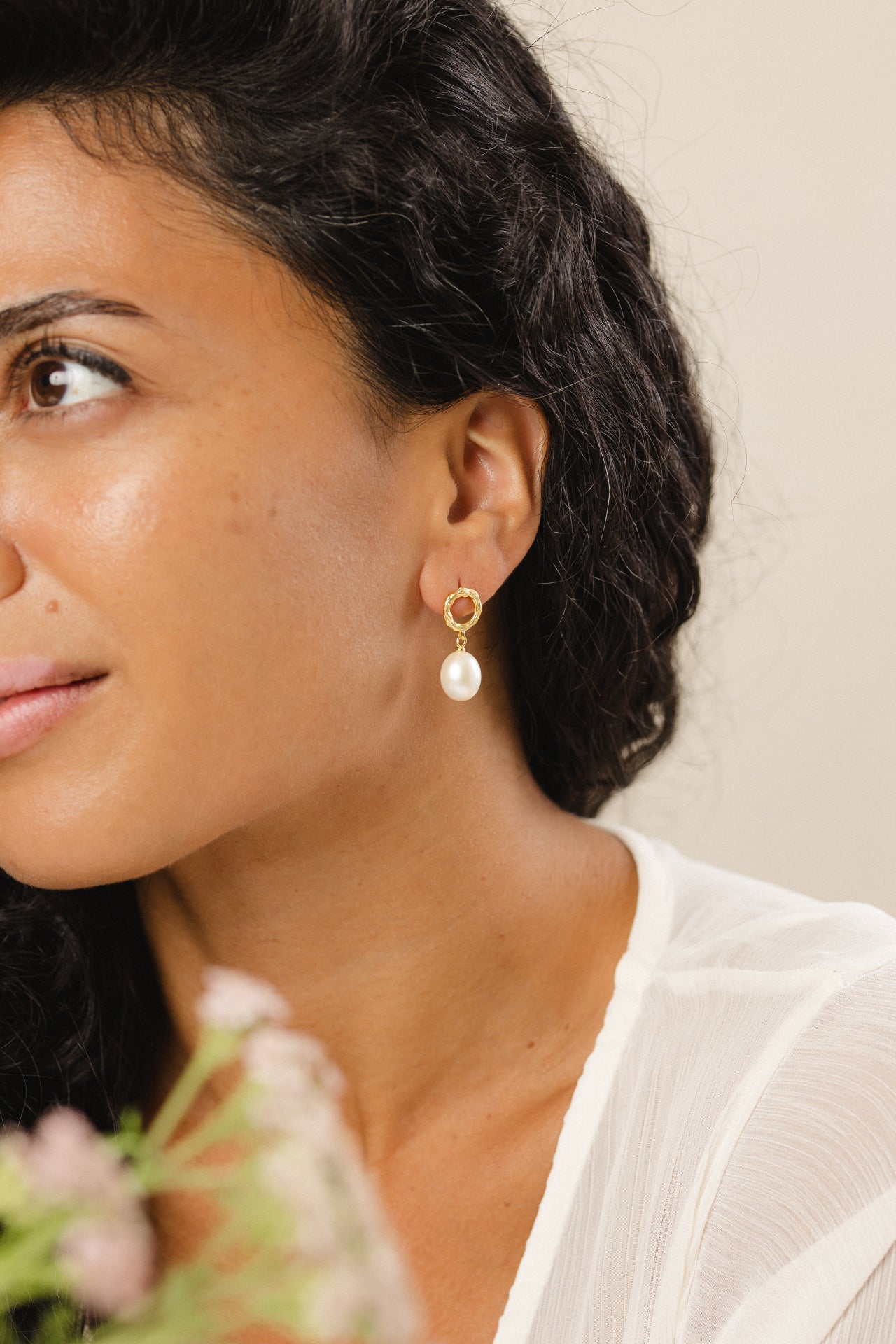 Our ROSA pearl drops are just stunning. A uniform fresh water pearl, and textured gold plated stud top.