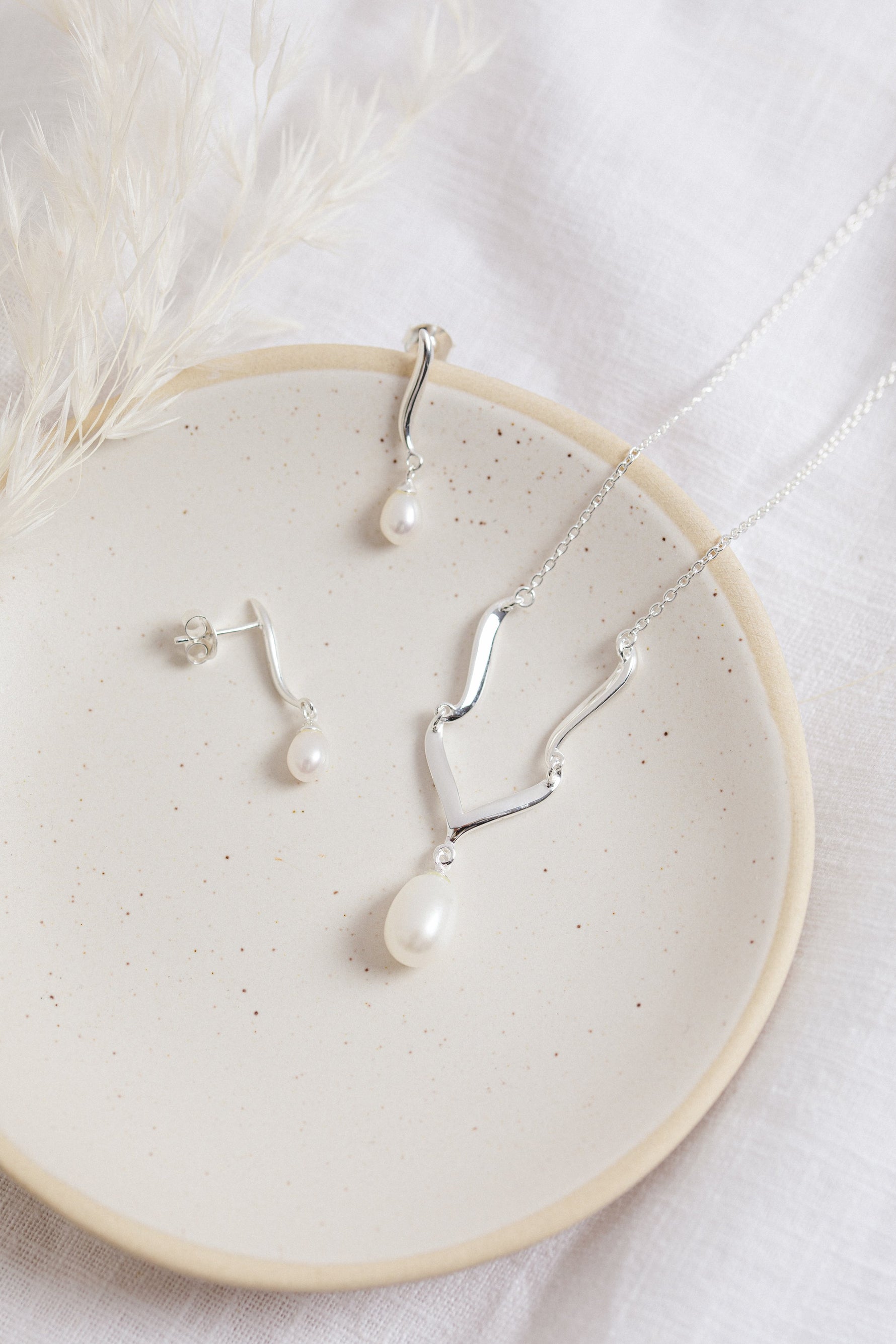 Like a beautiful fountain of water, our FONTAINE necklace cascades down your neckline with a beautiful teardrop pearl.